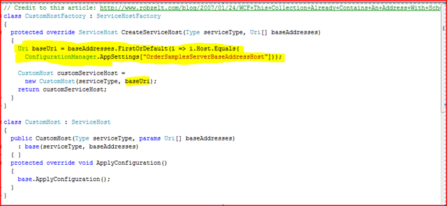 I wrap up my changes, and toss the code onto the client’s server and WCF turns into the devil. First stop, “WCF: This collection already contains an address with scheme http” message. One quick hit to Bing Google yields a few hits, including this dude’s solution. Basically, you have to remember, that WCF is steeped in theory of being agnostic of its host, and as such, when a specific host, like IIS in this case, barfs up several base addresses, WCF doesn’t know what the heck to do. So, that article’s solution is fine, except, I changed it slightly to have a configurable host name that we look up with a very simple linq-to-object query (I’m sure there are other ways to do this too, so don’t just take these solutions at face-value if you have a larger problem to solve):